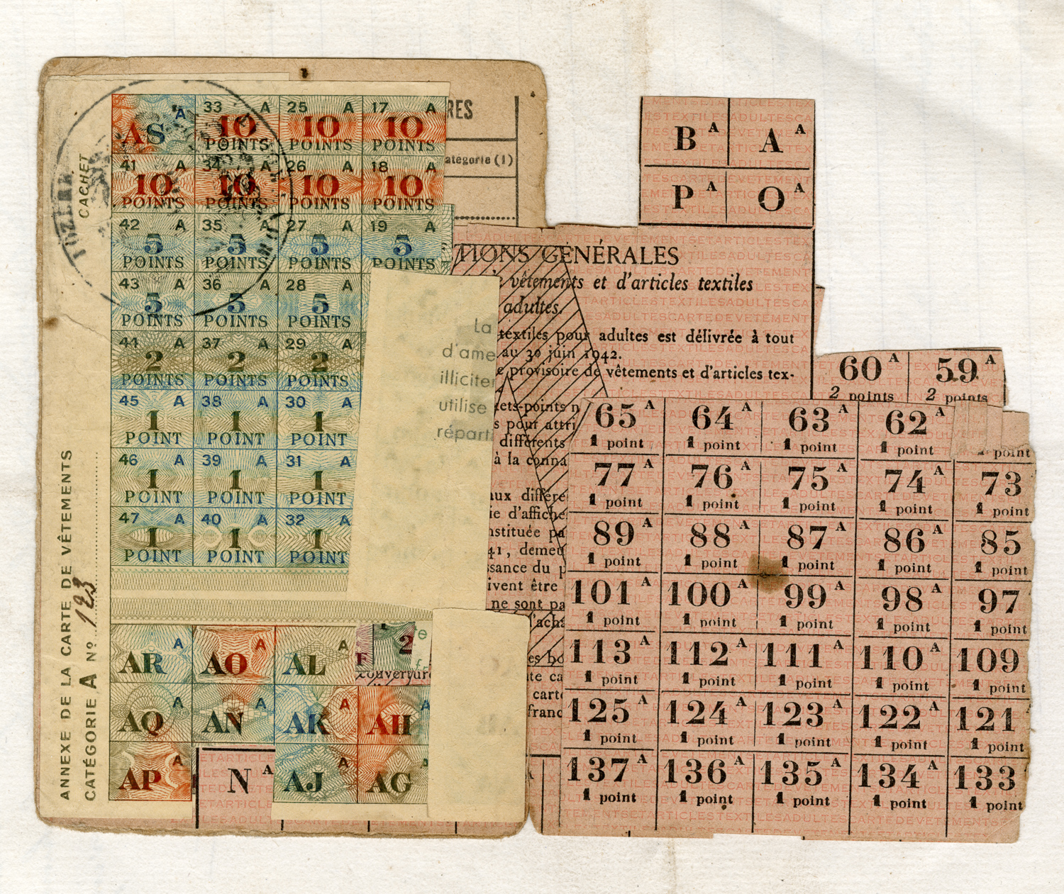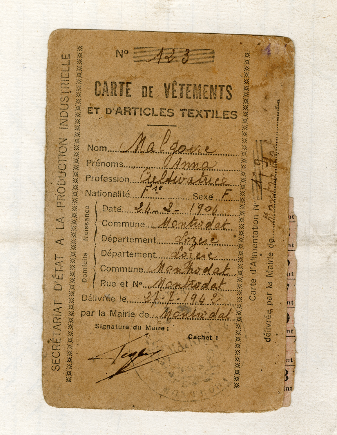 carte de vêtements et d’articles textiles d’Anna Malgoire, points utilisés,Montrodat, Lozère, 24/2/1906